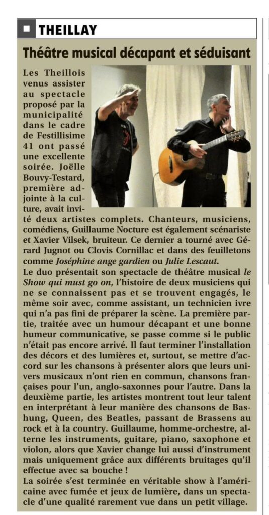 -Ca envoie du lourd !!! Quel plaisir d’avoir découvert ce show, car c’est bel et bien un ‘Show qui must go on’, un duo d’artistes comique, tel Laurel & Hardy, Guillaume et Xavier, respectivement le musicien musicien chanteur et bruiteur musicien chanteur hors pair de la bande. Interactivité garantie, des jeux de mots à la pelle. Un grand moment de plaisir, allez-y les yeux fermés et les oreilles ouvertes car ça envoie ! Merci Patrick, merci Gaby